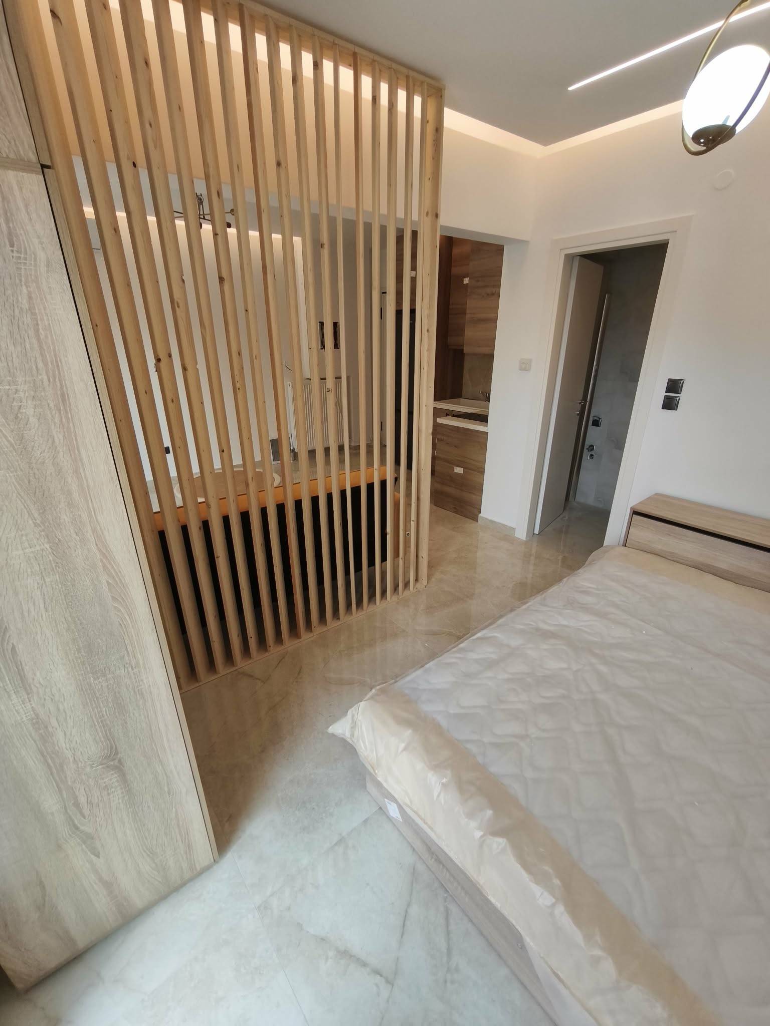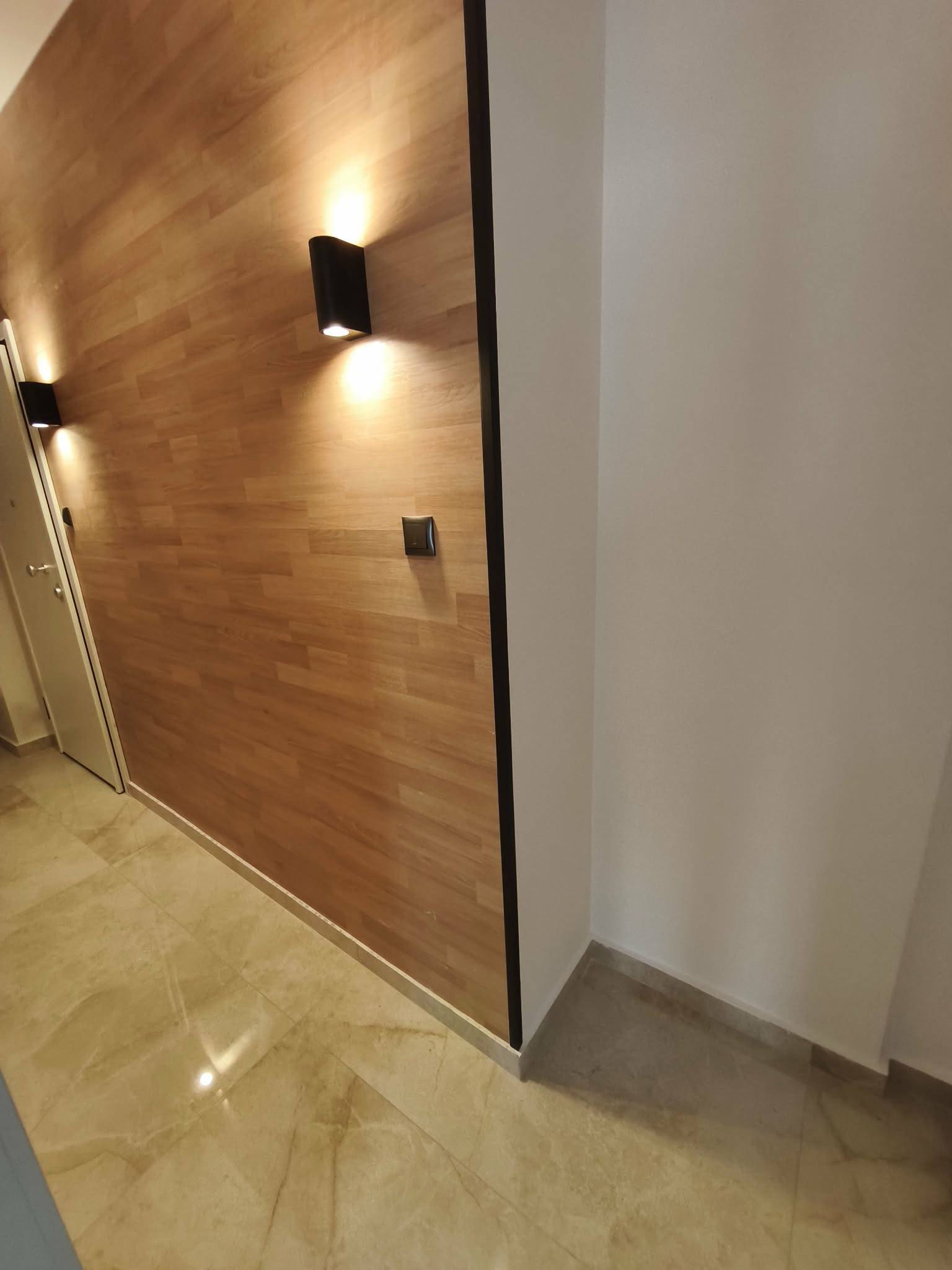 Σύγχρονη εσωτερική διακόσμηση με επενδύσεις ξύλου (διαχωριστικά sills), δάπεδα από μεγάλα πλακάκια με όψη μαρμάρου και κρυφό φωτισμό led στην οροφή, που δημιουργούν μια ατμόσφαιρα πολυτέλειας.