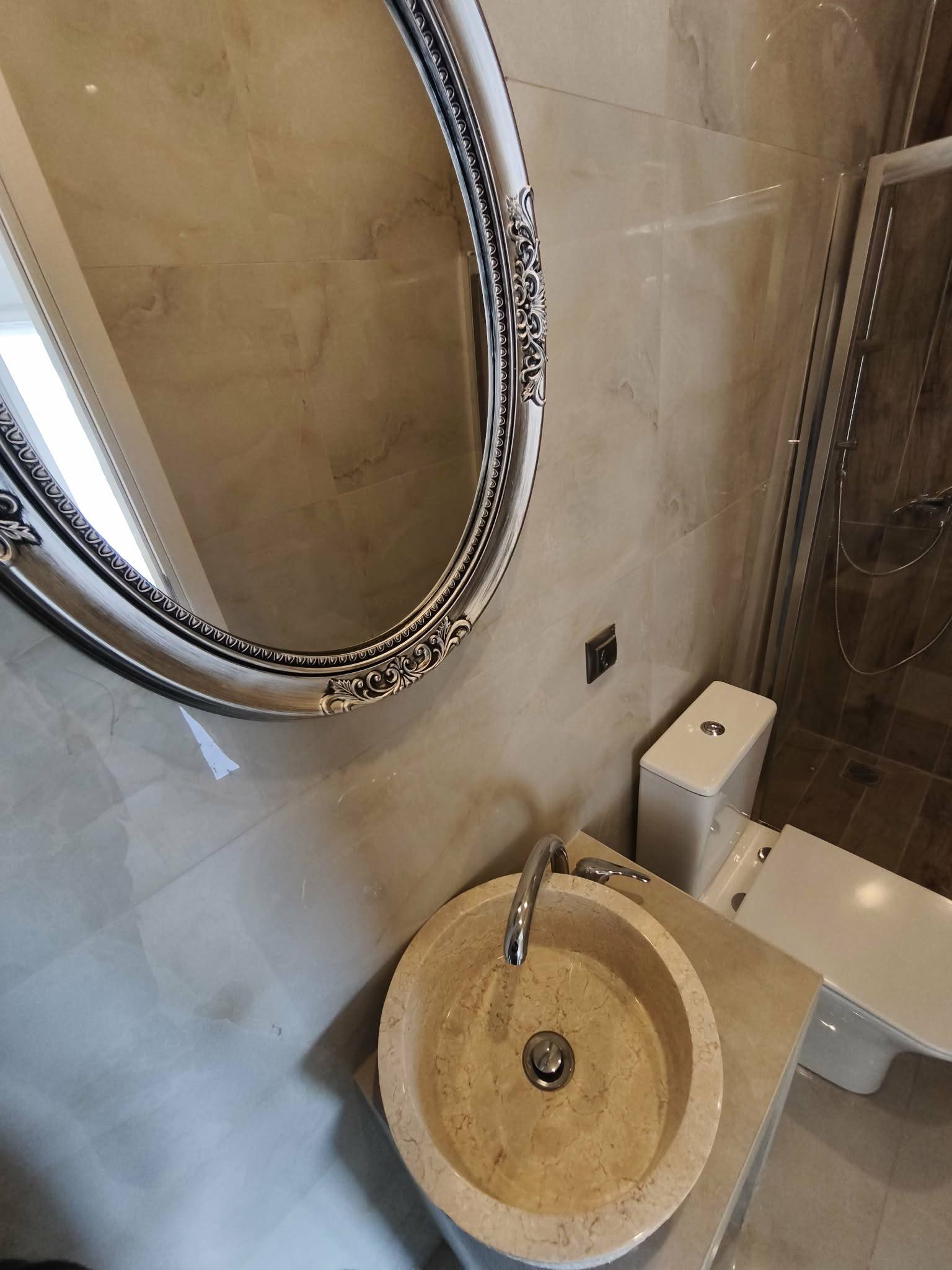 Μοντέρνο μπάνιο με ντουζιέρα - καμπίνα walk-in, ξύλινη επένδυση, επικαθήμενο πέτρινο νιπτήρα και vintage καθρέπτη με ασημί πλαίσιο.